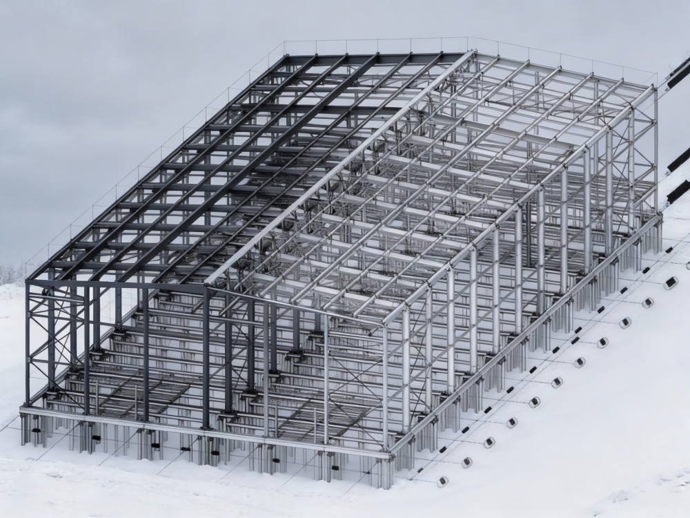 Мы решили использовать вариант комбинированного каркаса с использованием рам переменного сечения из сварного двутаврового профиля и ЛСТК конструкций для формирования прогонной системы.